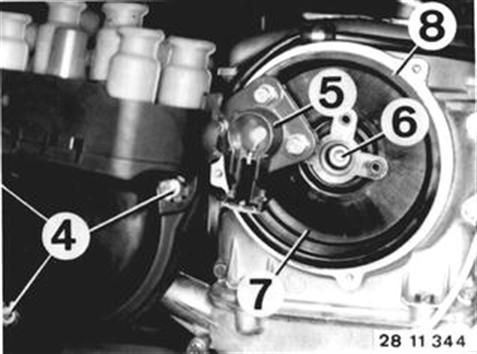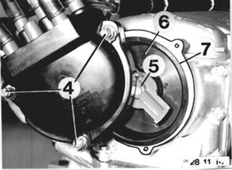 For DME with Inserted Distributor Arm: Take off distributor cap (4). Pull off distributor arm (5) and remove cover (6). Installation: Check rubber ring (7). | ![]() |