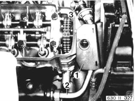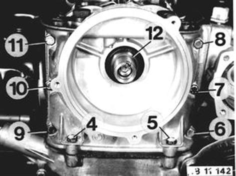 Unscrew timing case cover. Installation: Tighten screws (4 and 5) finger tight. Now tighten screws (6 ... 11) (8 and 9 are longer). If applicable, replace damaged cylinder head gasket - see 11 12 000. Check that radial oil seal fits correctly on the distributor rotor adapter (12). 11 12 000