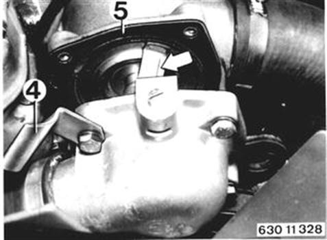 Drain part of coolant. Installation: Bleed cooling system 17 00 039. Take cover off of thermostat housing. Installation: Also mount bracket (4). Replace gasket (5). Remove thermostat. Important: Seal! Installation: Bracket on thermostat faces forward. 17 00 039