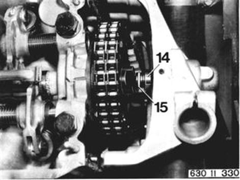 Remove timing case cover with helical gear (14). Installation: Check cord seal (15), replacing if necessary. If cylinder head gasket is damaged, remove cylinder head (see 11 12 100) and replace gasket. 11 12 100