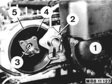 Take off distributor cap (1). Unscrew distributor rotor (2). Unscrew adapter (3). Remove cover (4). Installation: Check O-ring (5), replacing if necessary. Tightening torque*. * See Specifications