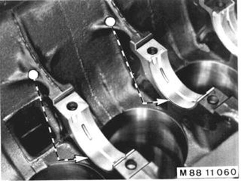 Bearing shells are installed in the crankcase according to the crankcase paint mark. If paint mark has been washed off of the crankcase, install both bearing shells to the crankshaft paint mark. If bearing shells supplied with a replacement crankshaft do not conform with tolerances (color code) of the crankcase, they must be exchanged in Parts. Bearing shells are installed in the bearing caps according to the crankshaft paint mark. | ![]() |