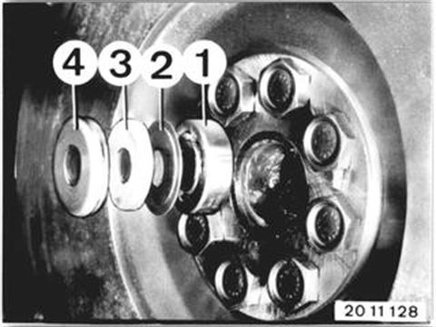 b) Version with Grooved Ball Bearing: Pull out grooved ball bearing (1), cover (2), felt ring (3) and end cap (4) from crankshaft with Special Tool 11 2 010. Installation: Pack bore in crankshaft with approx. 1 gram of brand name multi-purpose grease (drip point 180°C/356°F). Insert cover (2) with engraving facing out. | ![]() |