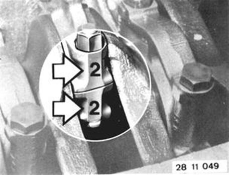 Installation: Measure conrod bearings. Use old conrod bolts to measure bearing play. Install conrod bearing shells in connecting rod. Place Type PG 1 Plastigage on crankshaft bearing journal dried of oil. Mount connecting rod on crankshaft. Install conrod bearing caps that lubricating grooves are adjacent to each other. Oil bore in conrod end faces timing chain. | ![]() |