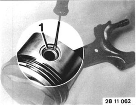 Remove circlip (1). Press out piston pin. Installation: Piston pins and pistons are matched and must not be mixed up. Install connecting rod, see 11 24 521. Only install pistons of same make and same weight class. Weight class is stamped with "+" or "-" in piston crown. 11 24 521