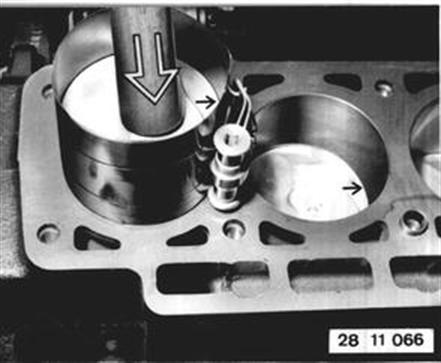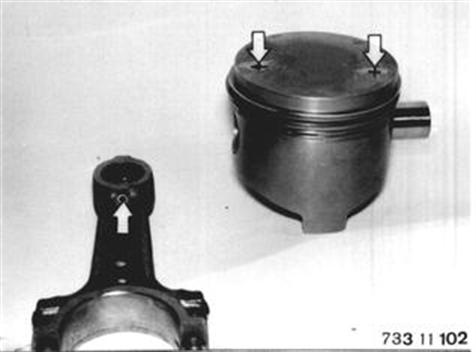 Vehicles after change point in 1982 REMOVING AND INSTALLING PISTON Remove engine. Take off cylinder head, oil pan and oil pump. Remove connecting rod bearing cap and press out piston with connecting rod upwards. Important! Mark installed position of connecting rod to crankshaft, if conrod bearing shells do not have to be replaced. | ![]() |