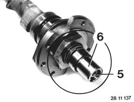 Vehicles after change point in 1982 REPLACING CAMSHAFT - Camshaft Removed - Cars with Plugged Distributor Rotor: Unscrew bolt (5) and take off adapter (6). Installation: Make sure milled surfaces engage with each other when installing adapter. Place seal on bolt (5) and screw in bolt with Loctite No. 270**. Tightening torque*. * See Specifications ** Source: HWB