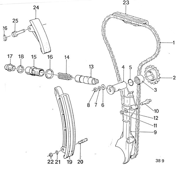 Valve Timing 1 Timing chain 2 Sprocket (guide wheel) 3 Needle sleeve 4 Shaft 5 O-ring 6 Shim 7 Spring washer 8 Nut 9 Guide rail 10 Bearing pin 11 Lock washer 12 Shim 13 Piston 14 Spring 15 Cylinder 16 Seal 17 Plug 18 Seal 19 Tensioning rail (lower) 20 Bearing pin (hollow) 21 Lock washer 22 Retainer 23 Guide rail 24 Tensioning rail (upper) 25 Bearing pin 26 O-ring | ![]() |