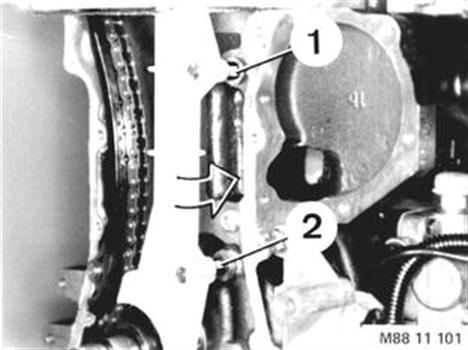 Unscrew bolt (1) and take off guide rail. Remove timing chain. Installation: Timing chain is pre-stretched. Use washers (3). | ![]() |
