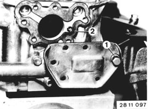 Vehicles after change point in 1982 REMOVING AND INSTALLING ROCKER ARM SHAFTS Remove camshaft 11 31 000. Unscrew end cover. Installation: Replace seal (1) and gasket (2). 11 31 000