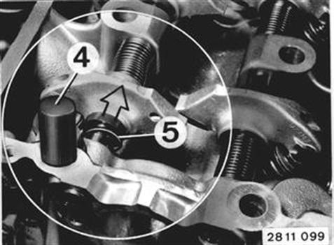 Push back rocker arms and thrust rings. Lift out circlips (5). Remove locating pin (4). | ![]() |
