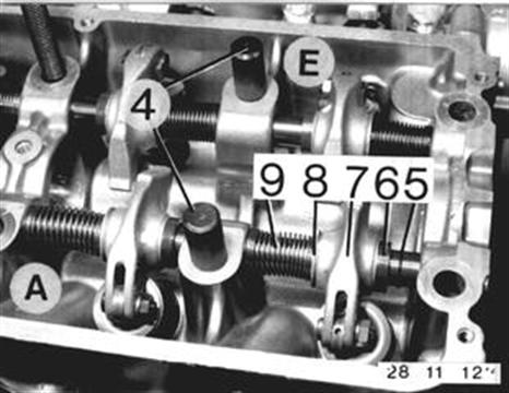 Installed Order: Spring (9), washer (8), rocker arm (7), thrust ring (6) and circlip (5). A = Exhaust side E = Intake side Align rocker arm shafts that cylinder head bolts fit in openings. Insert locating pins (4). Important! The new, shorter springs (9) could be installed mixed with the conventional long springs (9). | ![]() |