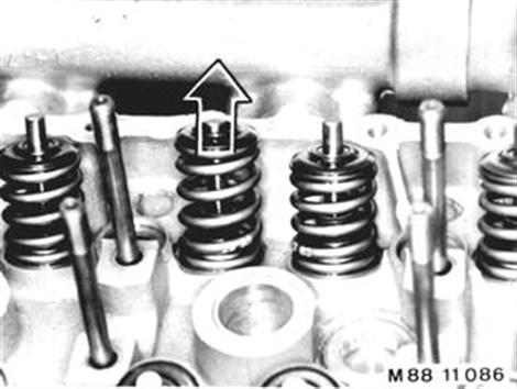 Remove upper spring retainer and valve springs. Take tray out of assembly stand and pull out valve. Installation: Lubricate valve guide and valve stem with oil. Double spring set can be installed retroactively together with the new spring retainers. | ![]() |