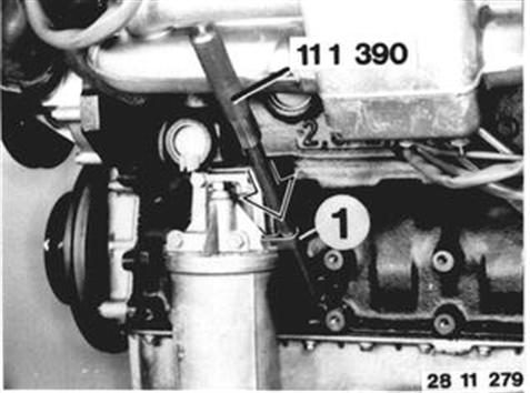 Vehicles after change point in 1982 REPLACING GUIDE TUBE FOR OIL DIPSTICK Transfer clamp (1). Install guide tube with Loctite No. 270** and drive in against stop. Installation: Eyelet grip of oil dipstick must always face left when looking forward in car to check the oil level. Non-conformance could cause incorrect readings, i.e. engine oil volume would not be as specified*. * See Specifications ** Source: HWB
