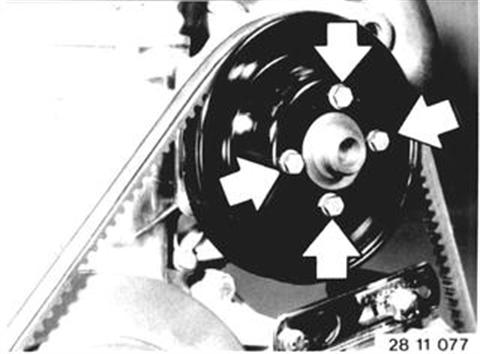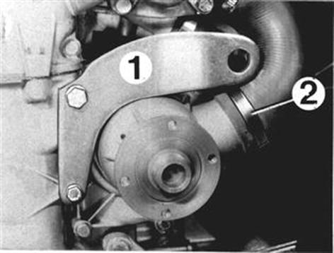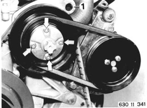 REMOVING AND INSTALLING WATER PUMP Remove fan 11 52 000. Take off flange and remove pulley. Detach bar (1). 11 52 000