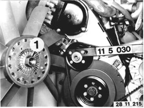 Vehicles after change point in 1982 REMOVING AND INSTALLING FAN Hold pulley with Special Tool 11 5 030 and unscrew coupling nut (1). Important! Left-hand threads - nut must be turned clockwise to unscrew. Tightening torque*. Installation: Tighten dan with Special Tool 11 5 040. Tightening torque is 40 Nm (29 ft. lbs.), which is equal to 30 Nm (22ft. lbs.) setting on the torque wrench. * See Specifications