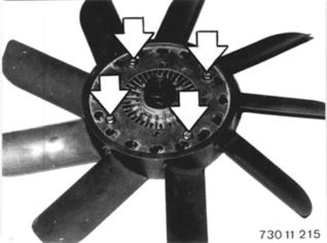 Vehicles after change point in 1982 REPLACING FAN CLUTCH Remove fan - see 11 52 000. Replace fan clutch, if a) hub has seized (fan of stopped engine cannot be turned or difficult to turn), b) fan clutch has axial and radial play or is losing oil. Check switching points* with a Vibrocard***. Unscrew fan mounting bolts and take off fan clutch. * See Specifications 11 52 000 *** See Workshop Equipment Catalog