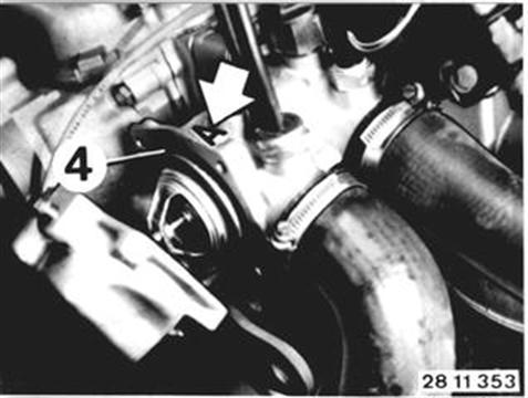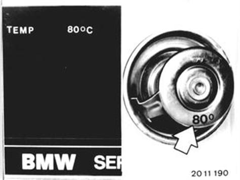 REMOVING AND INSTALLING COOLANT THERMOSTAT Drain part of coolant. Installation: Bleed cooling system 17 00 039. Remove cover. Take out thermostat. Check when thermostat begins to open¹) in a sink filled with hot water. Installation: Bracket on thermostat faces forward. 17 00 039 ¹) See Specifications