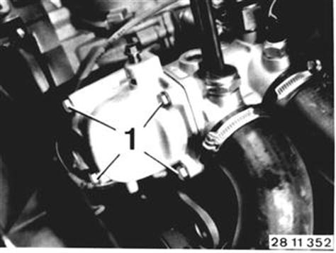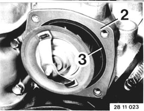 Vehicles after change point in 1982 REMOVING AND INSTALLING COOLANT THERMOSTAT Drain coolant partially. Unscrew cover (1). Installation: Bleed cooling system - see 17 00 039. 17 00 039