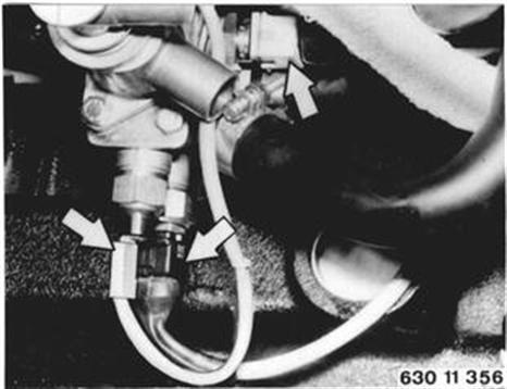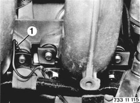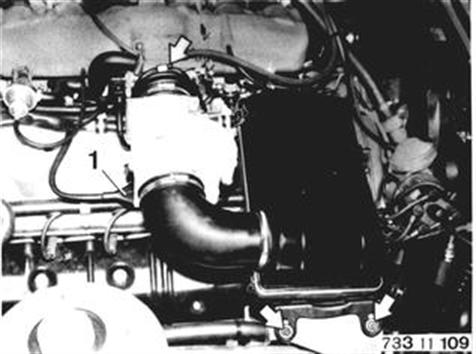REMOVING AND INSTALLING/SEALING ALL INTAKE NECKS Disconnect ground wire at battery. Loosen hose clamp. Installation: Install hose clamp that mounting screw faces up. Pull off plug (1). Detach air cleaner housing at wheel house. Drain coolant. Installation: Bleed cooling system 17 00 039. 17 00 039