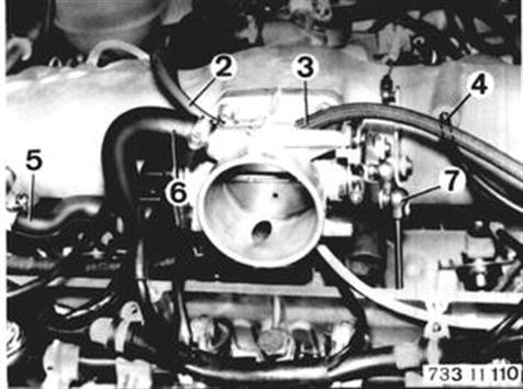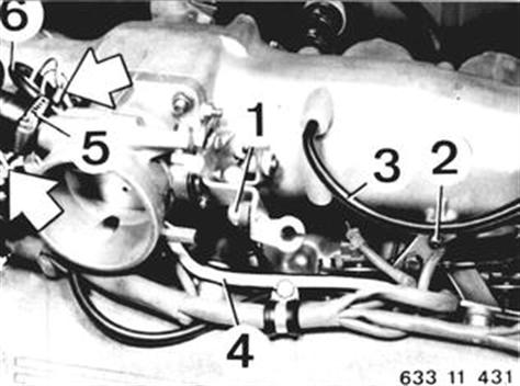 Disconnect sccelerator linkage (1). Cars with Tempomat Speed Cruise Control: Detach accelerator cable. Unscrew bracket (2) on both sides. Pull off wires on throttle switch. Detach hoses (3 ... 6). | ![]() |
