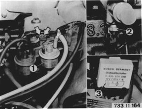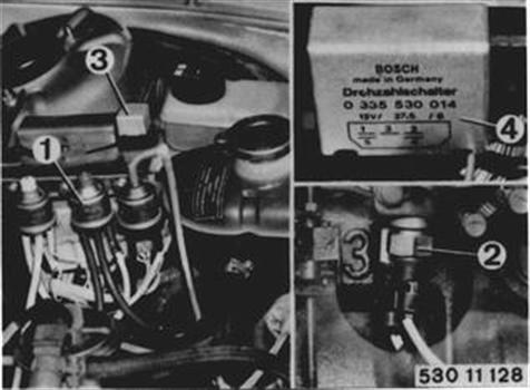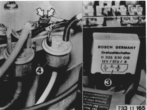 I) Speed Switch (3) Run engine at idle speed. Pull off plugs on blue switching valve (4) and connect test lamp between both poles. Test lamp should not come on. Test Lamp On: Speed switch is defective. Increase engine speed. Test lamp should come on above approx. 3750 rpm. Ground test lamp. If test lamp comes on now, power line has no ground connection. Test lamp still not on, speed switch is defective.
