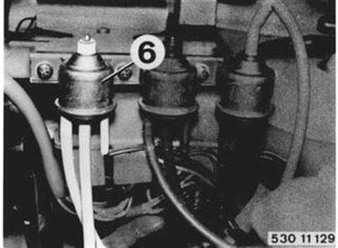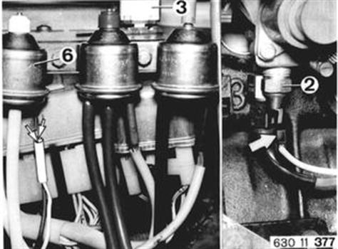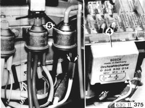 I) Speed Switch (4) Run engine at idle speed. Pull off plugs on blue switching valve (5) and connect a test lamp to both terminals. Test lamp must not be on. Test Lamp On: Speed switch is defective. Increase engine speed. As from approx. 3750 rpm test lamp should be on. Test Lamp Not On: Speed switch is defective. Ground wire has a break.