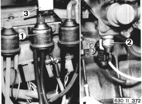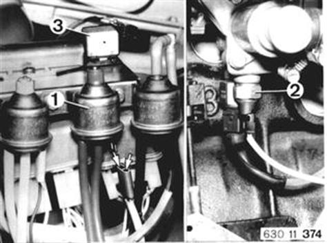 H) Coolant Temperature Switch (2) and Speed Switch (3) Coolant temperature above 45°C (113°F). Turn on ignition with engine stopped. Pull off plugs on red switching valve (1) and connect test lamp between both poles. Test lamp should be on. Test Lamp Not On: Coolant temperature switch is defective. Speed switch is defective. EGR relay is defective.
