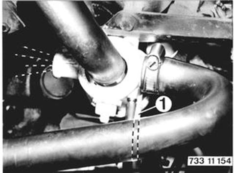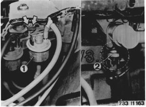 G) Water Temperature Switch (2) and Switching Relay (3) Coolant temperature below 45°C (113°F). Turn on ignition with engine stopped. Pull off plugs on switching valve (!) and connect test lamp to both terminals. Test lamp should come on. Test Lamp Not On: Water temperature switch is defective. Switching relay is defective. Ground wire has a break.
