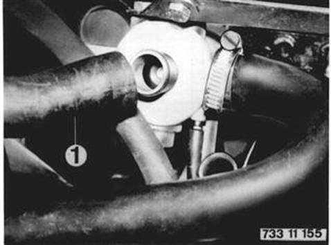 B) Blowoff Coasting Valve Blow off coasting valve prevent 1. backfiring in exhaust when releasing accelerator and 2. overloads on air pump. Check hoses for cracks, bends and correct routing. Pull off white hose (1) from blowoff coasting valve with engine running and coolant temperature below +45°C (113°F). Vacuum must be noticed. Attach hose (1) again. No air should escape from blowoff coastind valve while engine is running at idle. Open throttle by hand briefly and close again. Air should escape through opening on blowoff coasting valve for 1 to 3 seconds. No Air: Blowoff coasting valve is defective.