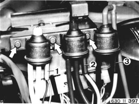 REPLACING ELECTRIC SWITCHING VALVE - black, red or white - Detach vacuum hoses. Installation: Connect hoses that colors match. (Also refer to hose routing plan.) Disconnect plugs (1 ... 3). Take electric switching valve out of holder.
