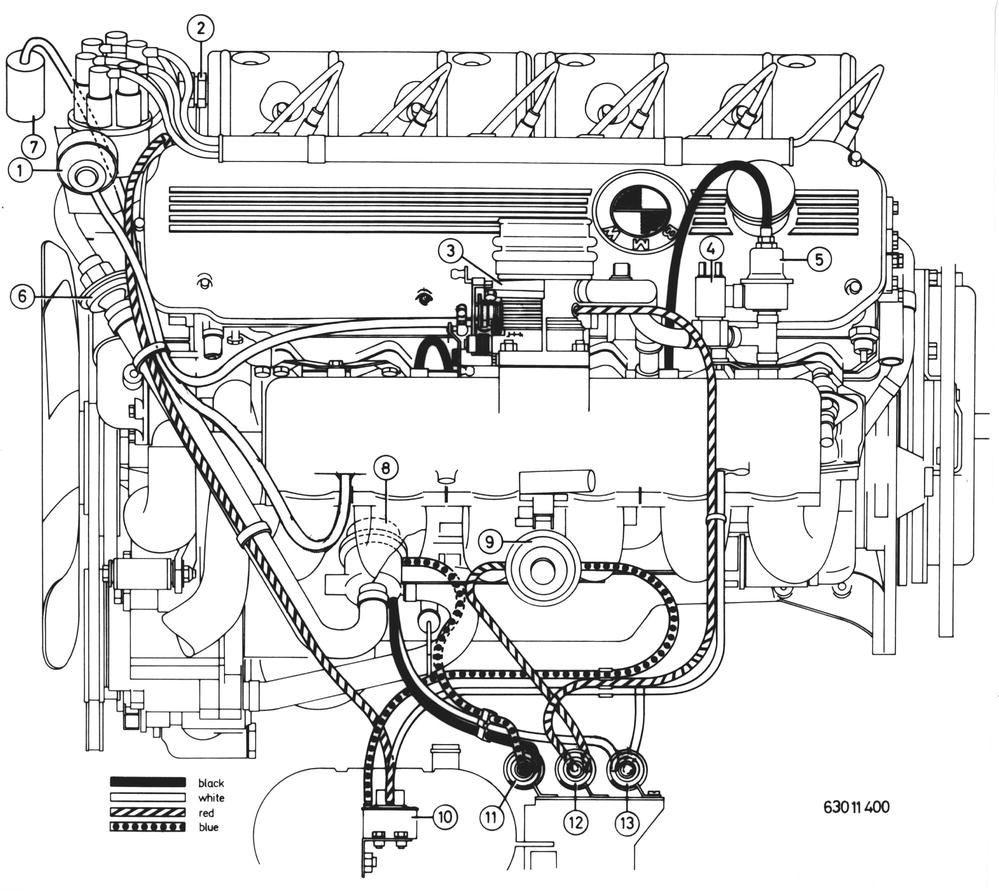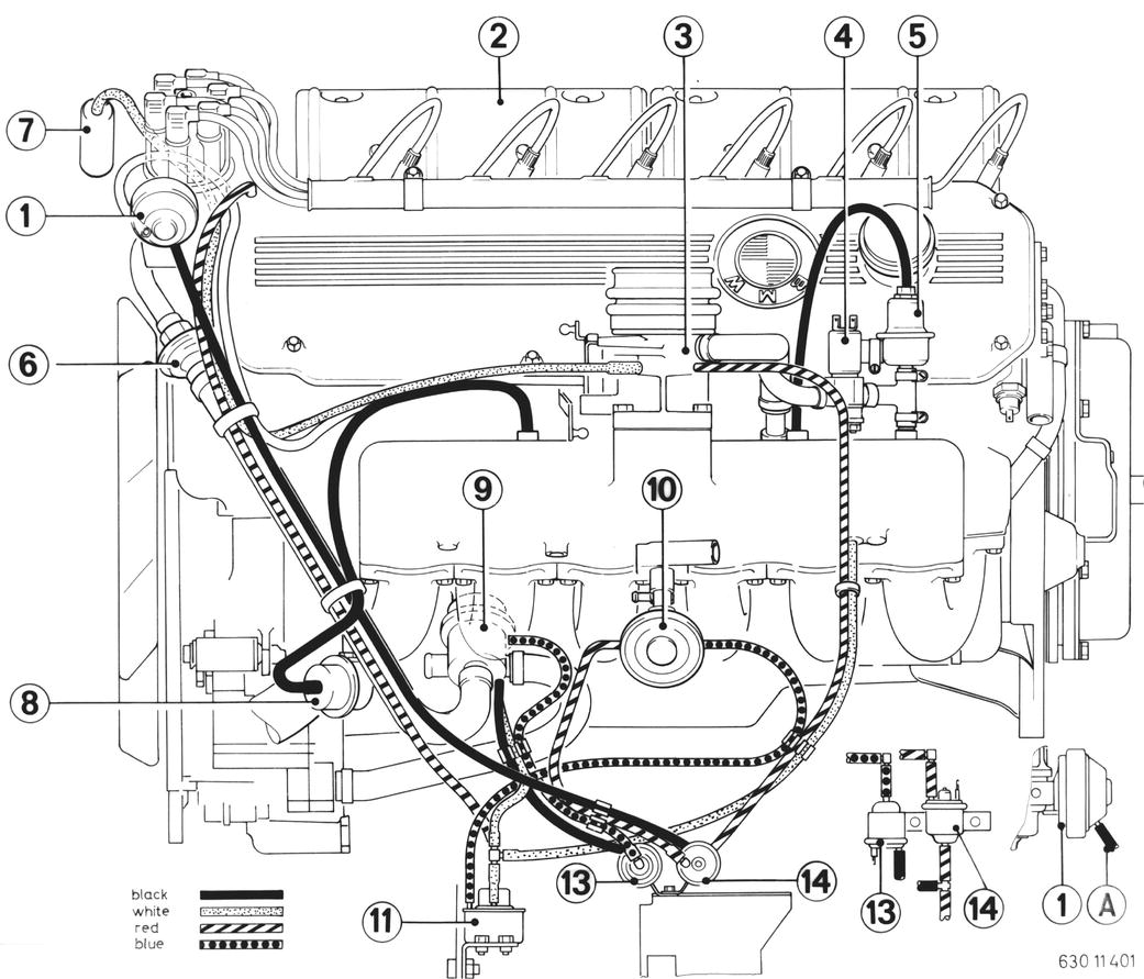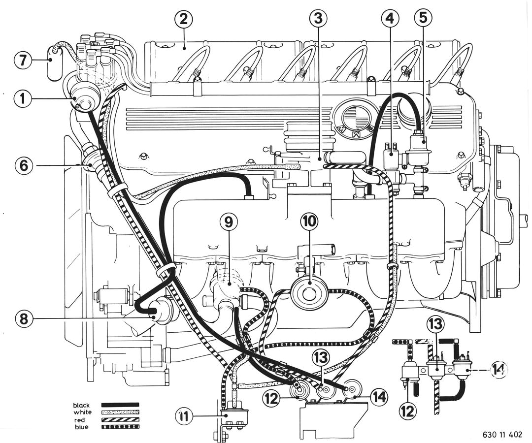 HOSE ROUTING PLAN a) BMW 630 CSi 1 Distributor vacuum box 2 Reactor 3 Throttle housing 4 Auxiliary air valve (n/a to 1977 models) 5 Vacuum control 6 Check valve 7 Carbon filter 8 Booster blowoff valve 9 EGR valve 10 Pressure converter 11 Black electric switching valve 12 Red electric switching valve 13 White electric switching valve