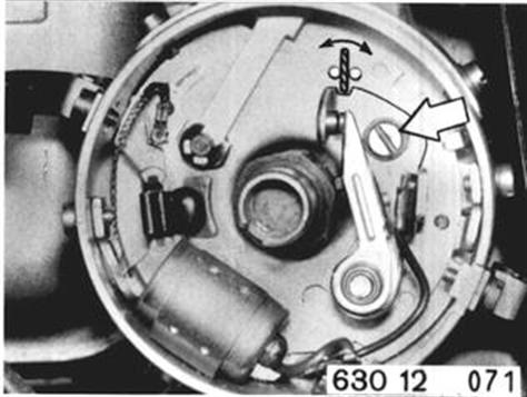 Version with Contact Breaker Points: Remove distributor cap, rotor and dust cap. Start engine. Adjust dwell angle¹) by turning the point carrier. The smallest value would be ideal. ¹) See microfilmed Specifications