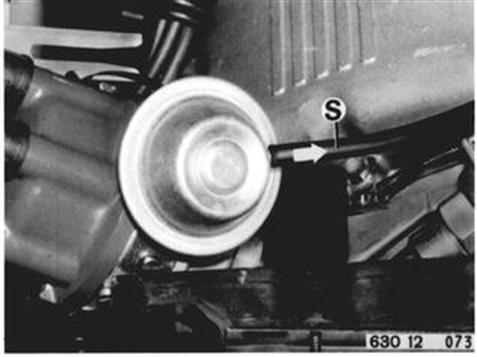 2) Ignition Timing A) BMW 630 i: Pull off vacuum hose (S). Start engine. Check ignition timing¹). Correct by loosening distributor mounting screw and turning the distributor to adjust the ignition timing. ¹) See microfilmed Specifications
