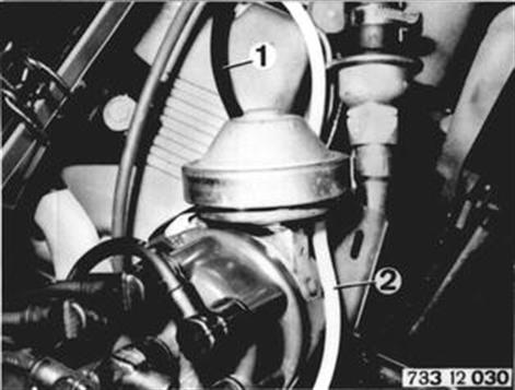 B) BMW 633 i: Pull off vacuum hoses for advance (1) and retard (2). California Version and 49 State High Altitude Version models with an automatic transmission will only have retard hose (2). The connection on vacuum box is plugged. Start engine. Check ignition timing¹). Correct by loosening distributor mounting screw and turning the distributor to adjust the ignition timing. ¹) See microfilmed Specifications