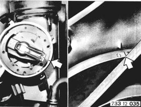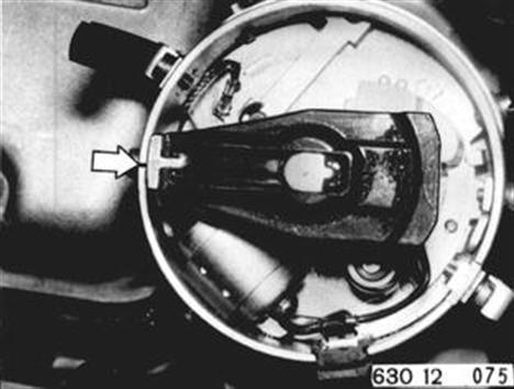 REMOVING AND INSTALLING DISTRIBUTOR A) BMW 630 i: Remove distributor cap. Disconnect wire at terminal 1. Detach vacuum hose. Pull off distributor rotor and remove dust cap. Install distributor rotor again. Set piston in cylinder no. 1 to TDC, i.e. distributor rotor aligns with notch in distribtor housing. Unscrew mounting screw and pull out distributor. | ![]() |