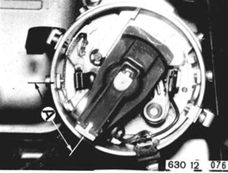 Installation: Turn distributor rotor anticlockwise away from notch in distributor housing by distance (A) = approx. 3.5 cm (1 3/8´´). Guide distributor drive into camshaft drive. Adjust ignition timing 12 11 004. 12 11 004