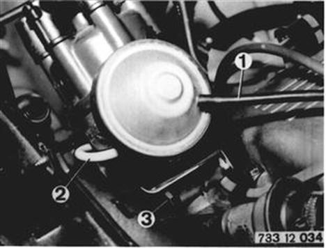 B) BMW 633 i: Important: Stop engine and turn off ignition prior to performing any work on a transistor ignition system. DANGER! Pull off vacuum hoses for advance (1) and retard (2). California Version and 49 State High Altitude Version models with an automatic transmission have only retard hose (2). Connection on vacuum box is plugged. Loosen bolt (3). Remove distributor cap. | ![]() |