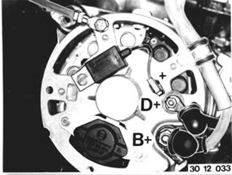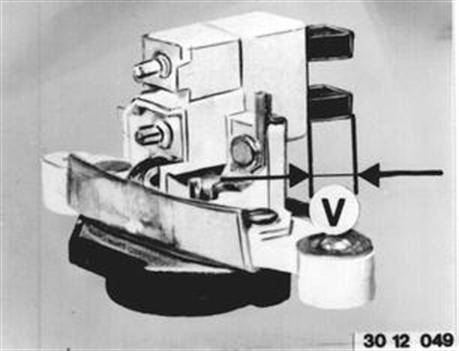 Indicator Lamp On Continusously: Remove voltage regulator and check carbon brushes, replacing if necessary - 12 31 200. Distance "V" for new condition = approx. 12 mm (0.472"). 12 31 200