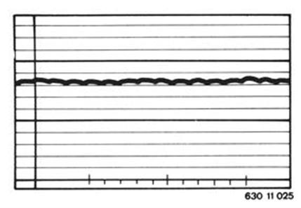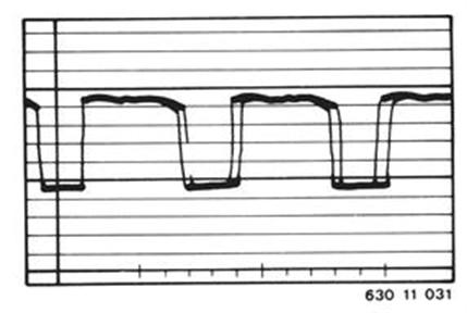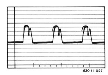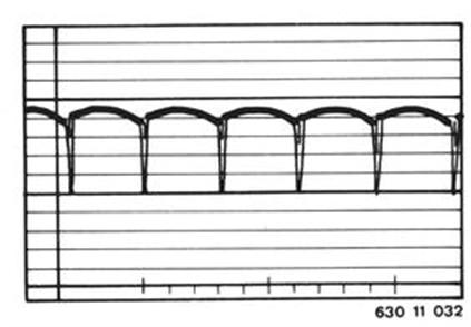 If the battery charge indicator lamp goes out while engine is running and the regulating voltage* is not reached - harmonic wave ratio and oscillograph okay (as shown) - the voltage regulator has to be replaced, see 12 32 000. 12 32 000
