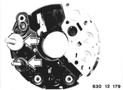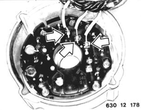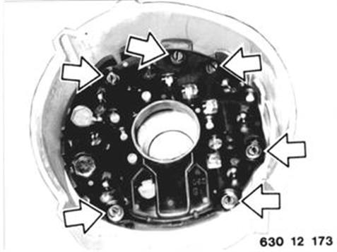 REPLACING DIODE PLATE Remove regulator. Mark installed position of housing (1) and slip ring bearing (2). Detach housing (1) at slip ring bearing (2). Installation: Stick corrugated washer in front of grooved ball bearing with Ft 1 v 34 grease.