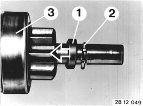 Push back bearing race (1) with a piece of suitable pipe. Pry circlip (2) apart and pull it off of the shaft. Remove burrs with a file. Take off drive pinion (3). Installation: Use new circlip (2). Lubricate bearing surfaces for drive pinion with grease. | ![]() |