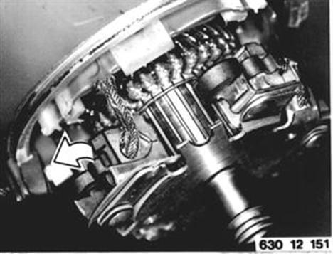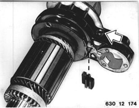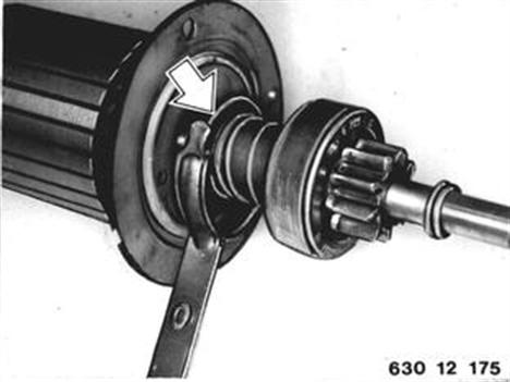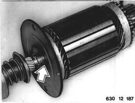 Lift out armature with drive pinion and engaging fork. Installation: Lubricate guide for engaging fork with grease. Check bearing sleeve in drive bearing bracket, lubricating with oil before installing. | ![]() |