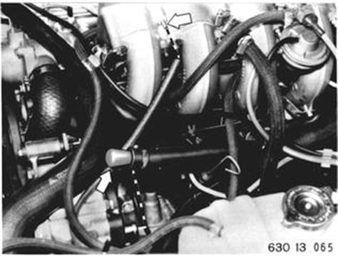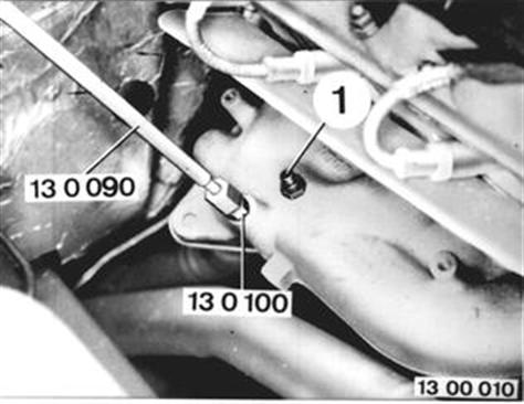 Unscrew bolts (1). Connect Special Tool 13 0 090 on exhaust manifold with adapter 13 0 100. Check idle speed CO level**. ** See Nominal Value Microfilm