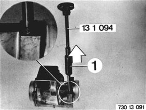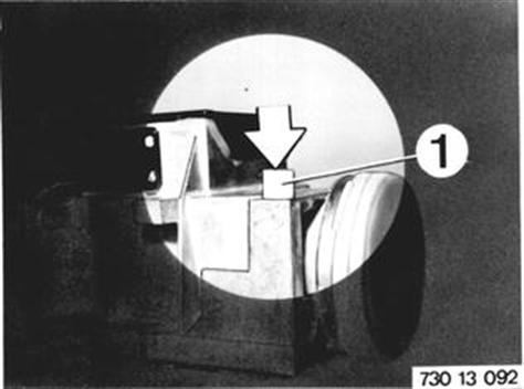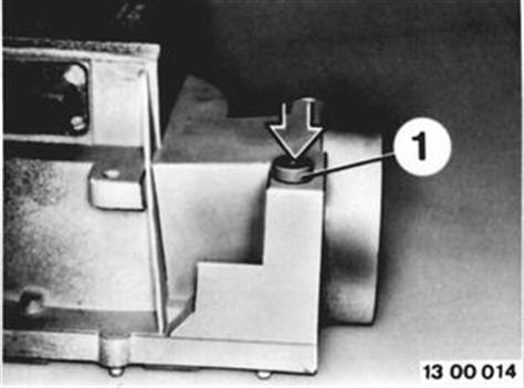 Version with Oxygen Sensor: Requirements for all tests: Engine at operating temperature, i.e. oil temperature at least 60°C (140°F). Ignition timing and valve play okay. All electric equipment switched off. CO tester warm and calibrated. A) Engine Idle Speed: Connect BMW service test unit according to operating instructions. Adjust idle speed¹) with screw (1). ¹) See microfilmed Specifications