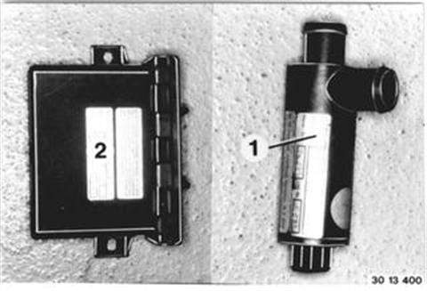 1) Engine Idle Speed: Check engine idle speed**. If specified valuw is not reached, check idle control valve (1) and idle speed regulation control unit (2), replacing if necessary. Note: There is no adjusting screw for idle speed regulation. ** See Nominal Value Microfilm