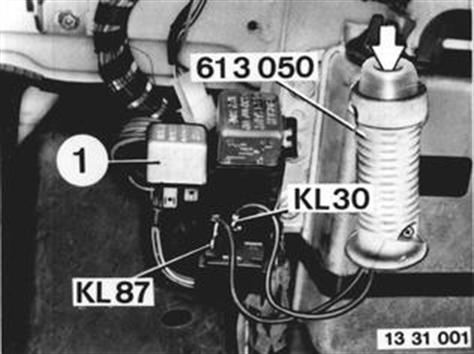 Open the glove box. Pull off fuel pump relay (1). Bridge term. 87 and 30 with Special Tool 61 3 050. The fuel pump runs. Check delivery rate*. * See Specifications of Gr. 16