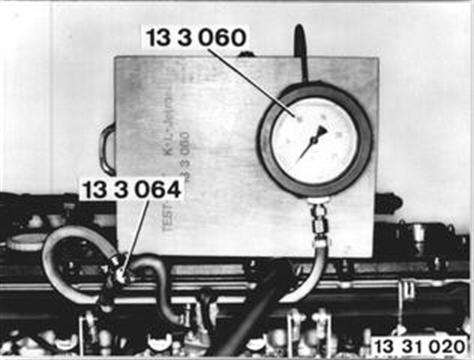 Checking Fuel Pump Delivery Pressure: Install pressure tester 13 3 060 with connecting hose and t-adapter 13 3 064 between the cold start valve and injection tube. Plug the fuel return hose with Special Tool 13 3 010. | ![]() |