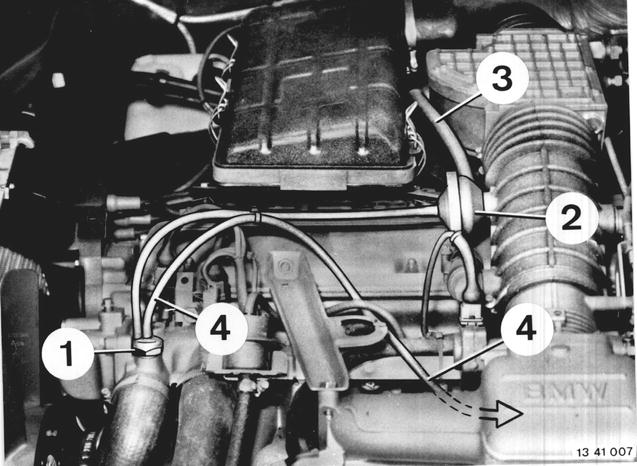 Note: If the fault is not eliminated after adjusting the throttle valve, the throttle valve must be returned back to its original setting. Cars with Active Carbon Filter Venting (US/ J): There must not be vacuum in hose (4) at idle speed in spite of possible adjusted throttle valve - check. | ![]() |