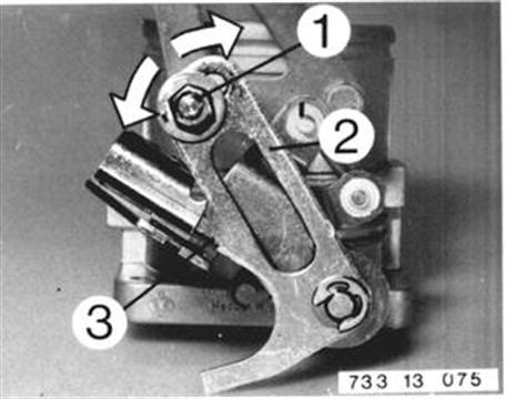 If the idle speed is <=750 rpm, the throttle valve basic setting must be changed. Loosen nut (1). Adjust connecting plate (2) with stop (3) (engine running) until the idle speed is 800 - 50 rpm. | ![]() |